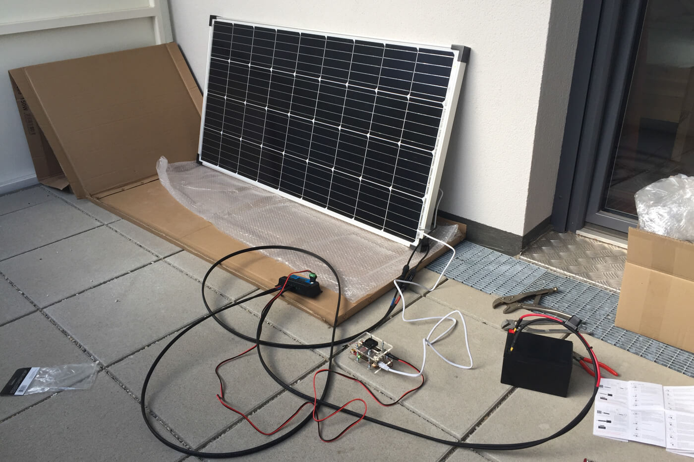 During a sunny day, the energy generated by a 150W solar-panel mounted on a balcony in Vienna powers a charge controller, a battery and a single-board computer. The latter is eventually connected to a router accessing the internet. When the sun isn’t shining, the battery can keep the server up for about three further days until it shuts down.
